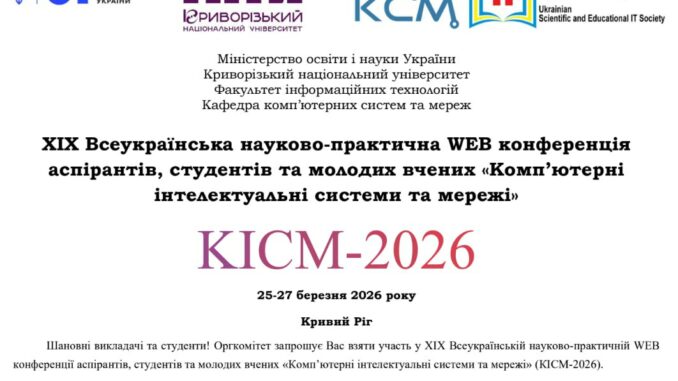 Оргкомітет запрошує Вас взяти участь у XIX Всеукраїнській науково-практичній WEB конференції аспірантів, студентів та молодих вчених «Комп’ютерні інтелектуальні системи та мережі» (КІСМ-2026).